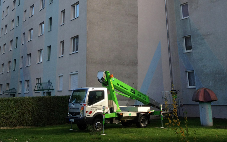 In den meisten Fällen reicht die teleskop Reinigungslanze vollkommen aus. Bei besonders hohen Gebäuden kommt ein Hebekran zum Einsatz.
